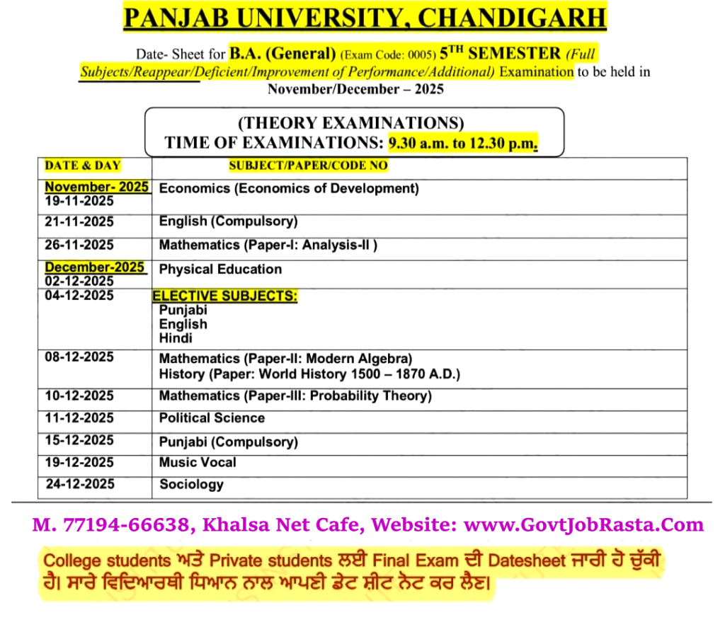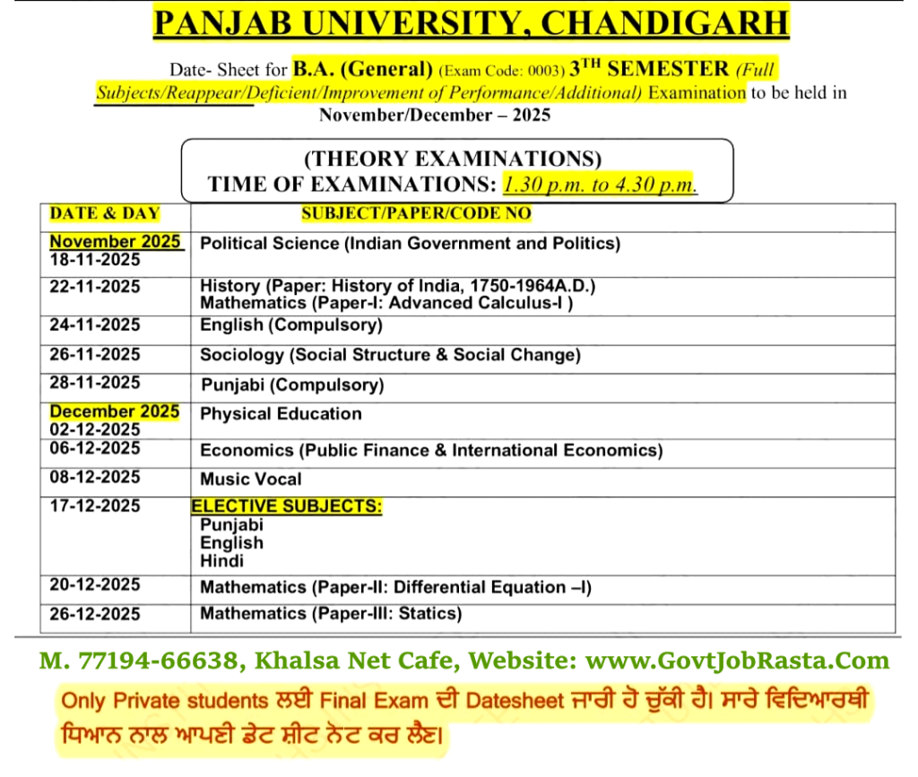 Panjab University Date Sheet 2025 1st Sem. Private Students, and CDOE 2025 B.A./B.Sc. (General/Hons.) 3RD SEMESTER (Reappear/Deficient/Additional Subjects/Improvement of Performance) 2025 WWW.GOVTJOBRASTA.COM | ||||||||||
