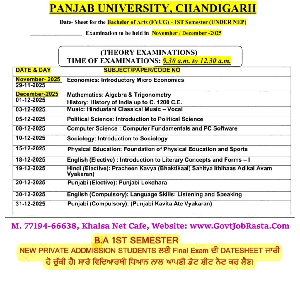 About Post : Download BA Private Panjab University Date Sheet 2025. The officials of Panjab University have released the Panjab University Date Sheet 2025 for B.A. Students are advised to check the timetable to prepare for their exams. Panjab University Date Sheet 2025 is Out! The Panjab University has released the B.A. For further updates on Panjab University, candidates can follow this page.