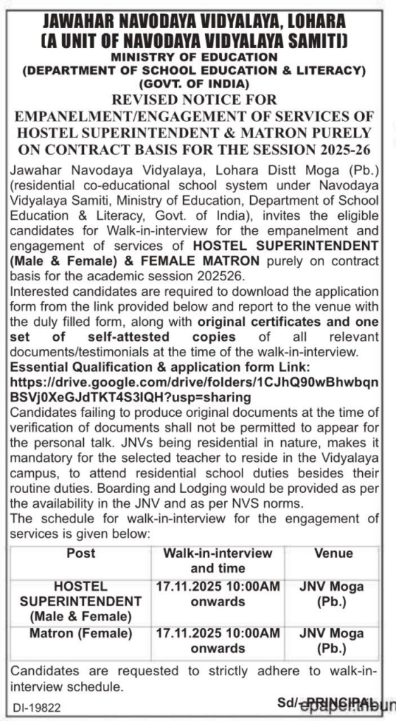 About Post :   : To apply for JNV Hostel Superintendent Matron Posts Form 2025. JNV Hostel Superintendent or Matron position, you must apply online through the Navodaya Vidyalaya Samiti (NVS) website or the regional NVS portal during the application period for your specific region. You need a graduation degree and to meet age and experience criteria to be eligible for contract roles. JNV, Lohara Distt Moga (Pb.), invites eligible female candidates for walk in interview for the past of Matron and Hostel Superintendent on contract basis for the session 2025-26. Condition for the post as mention below:– Eligible Candidates should present in the interview on date, time and place mention above along with original resume, Educational Certificate and one set of self-