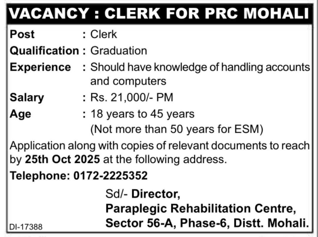 PRC Mohali Clerk Vacancy 2025 Eligibilities