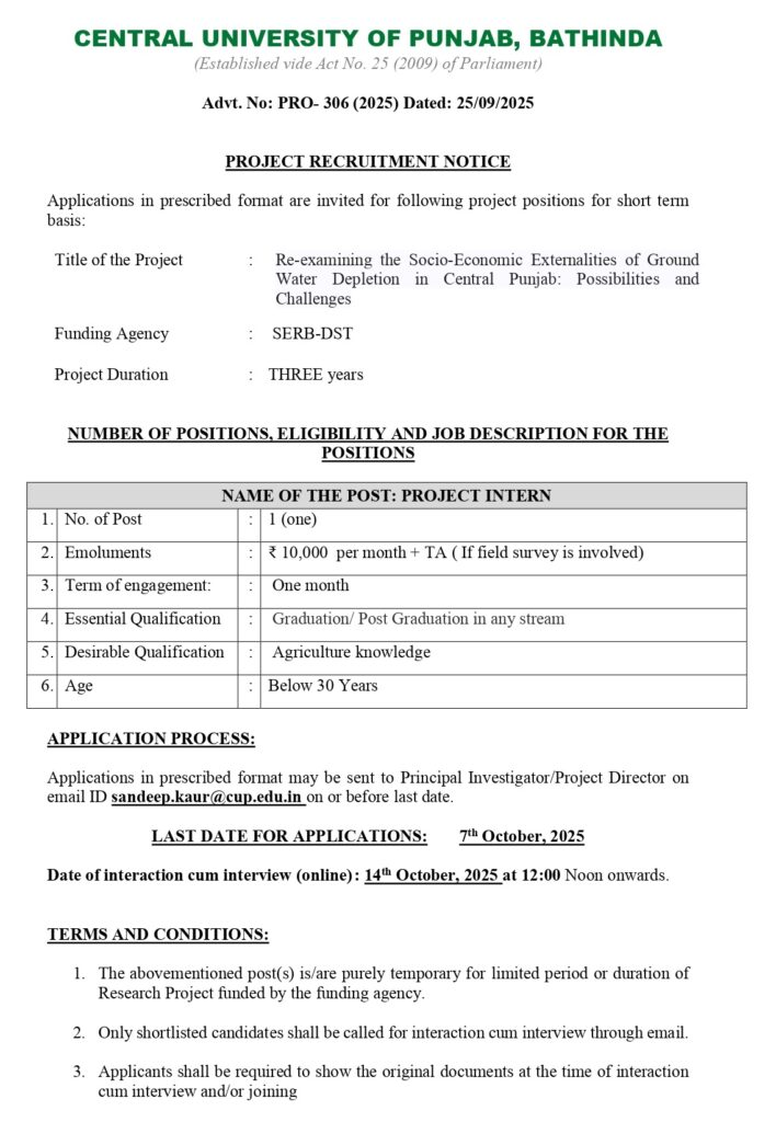 Central University Punjab PROJECT INTERN Recruitment 2025 Advt. No: PRO- 306 (2025) Dated: 25/09/2025 WWW.GOVTJOBRASTA.COM | ||||||||||